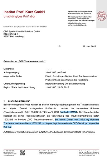 Wir bieten Ihnen pro Kapsel 250 mg reines OPC an. Somit müssen Sie nur eine Kapsel pro Tag nehmen und nicht mehrere wie bei den meisten Konkurrenzprodukten. Wir verzichten auf Zusatzstoffe, die das Produkt verbilligen; so kann das reine OPC seine volle Wirkung im Körper entfalten. Unser OPC wird nach strengsten europäischen Richtlinien hergestellt. Unsere Kapseln sind auch frei von Siliciumdioxid und Magnesiumstearat.Der Vorteil von OPC in Kapselform liegt darin, dass der Stoff langsam vom Körper aufgenommen und verarbeitet wird.