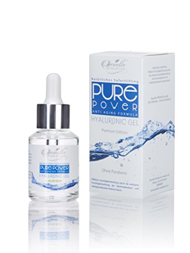 Das DEVELLE Pure Power Hyaluron Gel ist ein hochkonzentriertes kristallklares Hyaluron-Gel und enthält eine Kombination aus reiner hoch- und niedrigmolekularer Hyaluronsäure in Verbindung mit Aloe Vera und wirkt in den unterschiedlichen Schichten der Haut feuchtigkeitsbindend und hautstraffend. Hyaluron ist eine körpereigene Substanz. Hyaluronsäure gehört mit Wasser zur wichtigsten Füllsubstanz unseres Bindegewebes. Hyaluron besitzt die Fähigkeit, relativ zu ihrer Masse, enorme Mengen an Wasser zu binden (bis zum 1000-fachen seiner Eigenmasse). Sie können tatsächlich nach nur 2 Minuten eine hautstraffende Wirkung spüren. Dieser SOFORT-EFFEKT ist ausdrücklich beabsichtigt!