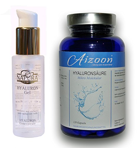 Eine Flasche mit 50ml Hyaluron-Complex aus nieder- und hochmolekularer Hyaluronsäure Dazu gibt es 120 Kapseln mit Hyaluron! Liste Inhaltstoffe und Hinweise auf Bild 3 Durch die Hyaluron-Konzentration ist der parfumfreie Feuchtigspender die ideale Intensivpflege für eine tägliche Anwendung auch für die Tages- oder Nachtpflege. Das Hyaluron-Gel ist in einer hochwertigen Kristallglasflasche mit Golddruck Prägung. Durch den Pump Dispenser können Sie perfekt dosieren. INGREDIENTS: Aqua, PentylenGlycol,Glycerin, SodiumHyaluronate, Dimethicone Copolyol,Panthenol, Propylen Glycol, Phenoxyetanol, Methylsothiazolinone. Developed by German scientists and dermatologist Anwendung: gleichmäßig auf gereinigte Gesichtshaut, Decolleté oder Handrücken auftragen. Vorzugsweise morgens und abends. Dermatologisch getestet durch DERMATEST Research Münster Nahrungsergänzungsmittel sind kein Ersatz für eine ausgewogene und abwechslungsreiche Ernährung