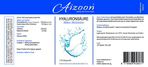 Eine Flasche mit 50ml Hyaluron-Complex aus nieder- und hochmolekularer Hyaluronsäure Dazu gibt es 120 Kapseln mit Hyaluron! Liste Inhaltstoffe und Hinweise auf Bild 3 Durch die Hyaluron-Konzentration ist der parfumfreie Feuchtigspender die ideale Intensivpflege für eine tägliche Anwendung auch für die Tages- oder Nachtpflege. Das Hyaluron-Gel ist in einer hochwertigen Kristallglasflasche mit Golddruck Prägung. Durch den Pump Dispenser können Sie perfekt dosieren. INGREDIENTS: Aqua, PentylenGlycol,Glycerin, SodiumHyaluronate, Dimethicone Copolyol,Panthenol, Propylen Glycol, Phenoxyetanol, Methylsothiazolinone. Developed by German scientists and dermatologist Anwendung: gleichmäßig auf gereinigte Gesichtshaut, Decolleté oder Handrücken auftragen. Vorzugsweise morgens und abends. Dermatologisch getestet durch DERMATEST Research Münster Nahrungsergänzungsmittel sind kein Ersatz für eine ausgewogene und abwechslungsreiche Ernährung