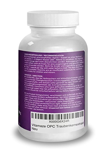 Die Vitamaze GmbH entwickelt mit erfahrenen Spezialisten anwenderfreundliche Nahrungsergänzungsmittel, welche ausschließlich in Deutschland hergestellt werden. Die ständige Qualitätssicherung ist ein wesentliches Merkmal, das höchste Priorität genießt. Unser OPC-Produkt überzeugt auch Experten und unsere treuen Kunden. Diese empfehlen gerne unser Produkt wegen: – der optimierten physiologischen Kombination vom hochdosiertem OPC (475 mg pro Kapsel) mit Vitamin C. Vitamin C trägt zu einer normalen Funktion des Immunsystems bei – der extra großen XL-Dose mit 180 Kapseln für 6 Monate OPC: Preis-Leistungs-SIEGER – der Eignung für Allergiker – der Qualität made in Germany: Unsere Produktion richtet sich nach dem offiziellen GMP Standard. Vitamaze OPC (Oligomere Proanthocyanidine) oder auch oft Vitamin P genannt wird aus hochwertigen Traubenkernen (vitis vinifera) gewonnen und hoch konzentriert (120:1). Im Internet finden Sie viele weitere Informationen zu OPC. Bitte achten Sie dabei auf die Qualität. Profitieren Sie heute von dem speziellen Online-Preis direkt vom Hersteller und sparen Sie gute 17 Euro. Selbstverständlich nehmen wir unser OPC kostenlos innerhalb von 30 Tagen auch wieder zurück.